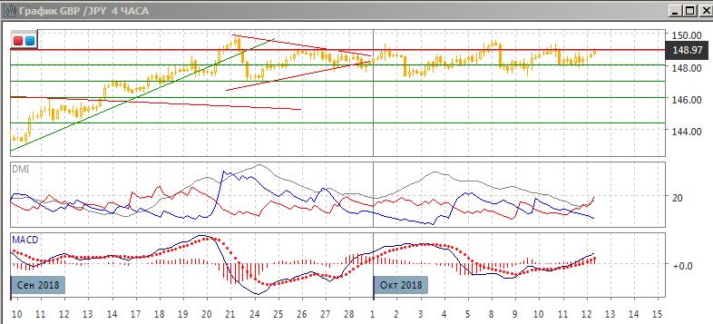 На четырёхчасовом графике пара снова находится около верхней границы канала с конца сентября 147-149. С начала октября минимумы пары растут, и в последний откат от верхней границы канала 149 пара получила поддержку на 148,00, то есть на середине канала. Это увеличивает вероятность выхода из канала вверх. При закреплении выше 149,00 цель исходя из размера канала может быть 151,00.