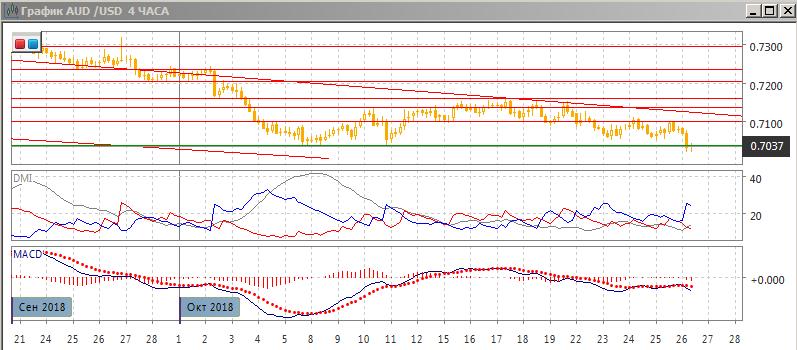 На четырёхчасовом графике снижение продолжается, уровень 0,7100 выступил сопротивлением после преодоления этого уровня 22 октября. Пара достигла уровня поддержки на 0,7040 — на минимумах 5-11 октября. Дальнейшее движение зависит, вероятно, от устойчивости этого уровня — закрепление выше открывает пространство для дальнейшего снижения, при восстановлении выше 0,7040, если пара закрепится выше, можно было бы ожидать отскока в 0,7100.