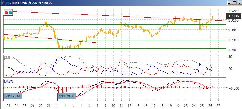 На четырёхчасовом графике пара полностью восстановилась от сильного снижения после заседания Банка Канады по денежной политике в среду. Отсутствие развития первоначального движения и полная его нейтрализация скорее говорят о том, что направлением наименьшего сопротивления является рост: при отсутствии новостного фактора пара постепенно растёт. В начале пятницы пара достигла более высокого уровня, чем максимумы 19-23 октября. Преодоление этой зоне не оставляет ближайших уровней сопротивления в этом масштабе, и скорее рост пары продолжится. По индикаторам направленного движения пара вновь перешла к росту: DM+ выше DM-, гистограмма MACD растёт уже в положительной зоне, линия MACD получила положительный наклон.