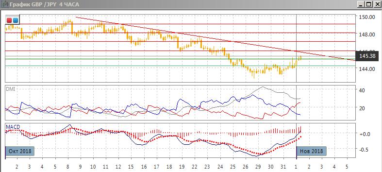 На дневном графике пара приблизилась к к приблизилась к нисходящей линии тренда, но пространство для роста до него ещё есть. Рост конца октября продолжился, после образования «падающей звезды» пара выросла, и если закрытие будет с существенным ростом, что сигнал от свечи не будет подтверждён. Пара остаётся ниже краткосрочной линии тренда (сейчас находится около 146). По индикаторам направленного движения коррекция к снижению: превышение DM- над DM+ остаётся большим, гистограмма MACD выросла, но остаётся в отрицательной зоне, линия MACD сохраняет отрицательный наклон.