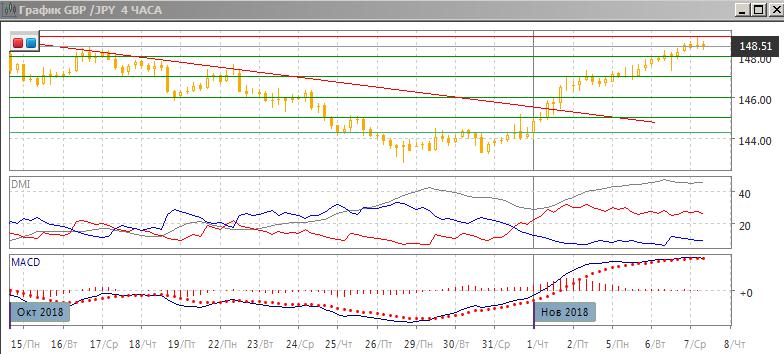 На четырёхчасовом графике ниже 149,00 образовалась разворотная свечная комбинация с «падающей звездой». Последовательность роста относительных максимумов и минимумов пары сохраняется. Тенденция роста остаётся сильной по ADX, превышение DM+ над DM- большое и устойчивое, ADX на высоком уровне. Однако волна роста продолжается уже долго от 143 без существенных откатов, исходя из этого откат назревает. Сохраняется медвежье расхождение максимумов пары и гистограммы MACD, что также увеличивает вероятность отката .