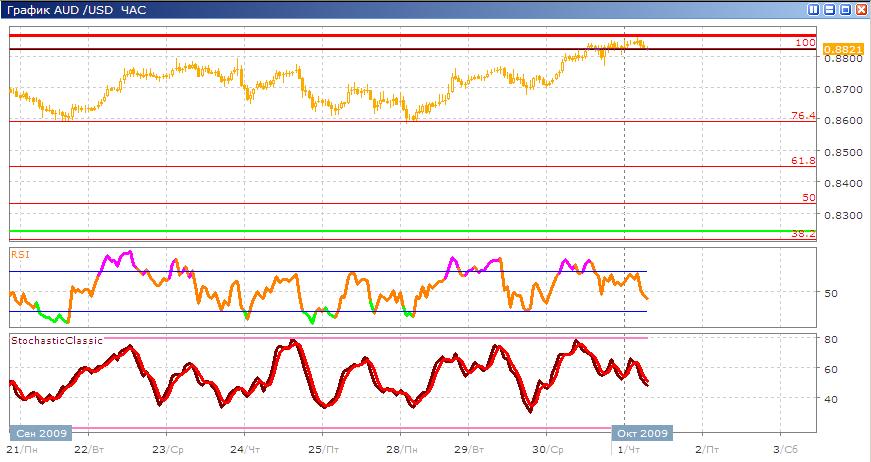 Австралиец достиг своей цели в 0,8822 и даже слегка пробил ее это лучший его показатель за год. Сейчас он разворачивается в обратную сторону, произошел отскок от этого уровня. Возможно, на этом его восходящее движение закончилось, а может и нет еще будет пробивать новые максимумы. Кажется, более вероятным сценарий при котором он отскочит к уровню 76,4% по Фибоначчи. На это также указывают индикаторы такие как Stohastic, который после пересечения направился вниз указывая направление движения, тоже происходит и с RSI он из зоны близкой к перекупленности направляется вниз.