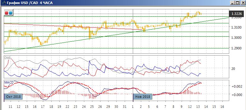 На четырёхчасовом графике последовательный рост пары продолжается. Тенденция роста сильная. Пара находится немного ниже уровня перекупленности по RSI. Гистограмма MACD остаётся в положительной зоне, но образовалось медвежье расхождение максимумов пары и гистограммы MACD. При откате ближайшая поддержка может быть на «круглом» уровне 1,3200 (как произошло 12 ноября). По ADX тенденция роста сильная: превышение DM+ над DM- большое и устойчивое, ADX на высоком уровне и растёт. Хотя откат сейчас возможен, в целом рост пока, скорее всего, будет продолжаться.