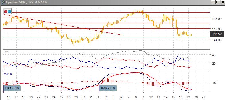 На четырёхчасовом графике консолидация около 148,00 завершилась резким снижением и преодолением уровня минимума 12-13 октября (поддержка на 146,00). Поддержку пара получила только на 144,30 (это сопротивление в конце октября). Движение пары сейчас обусловлено более новостным фоном из Великобритании, и технический аспект становится менее важным. У 144,30 может образоваться бычье расхождение минимумов пары и гистограммы MACD, что увеличило бы вероятность отскока. Кроме этого, размер коррекции по отношению к размеру снижения от 148,00 невелик. Это может говорить как по силе тенденции снижения, так и о том, что может назревать отскок вверх. Пока продолжение снижения видится предпочтительным, но рассчитывать на него стоит при преодолении уровня 144,30. По ADX снижение является сильной тенденцией, превышение DM- над DM+ большое при высоком и растущем уровне ADX.