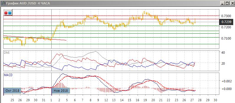 На четырёхчасовом графике пара вновь выросла от 0,7200, скорее наступила стабилизация между 0,7200 и 0,7300. По индикаторам направленного движения пара нейтральна, ADX на низком уровне, гистограмма MACD около нуля, линия MACD близка к горизонтали. Так как ранее пара получала поддержку на 0,7200, вероятность продолжения отсока от этого уровня велика, и рассчитывать на снижение до преодоления уровня 0,7200 рискованно. В рамках движения в диапазоне предпочтительно движение к следующему уровню сопротивления на 0,7265.
