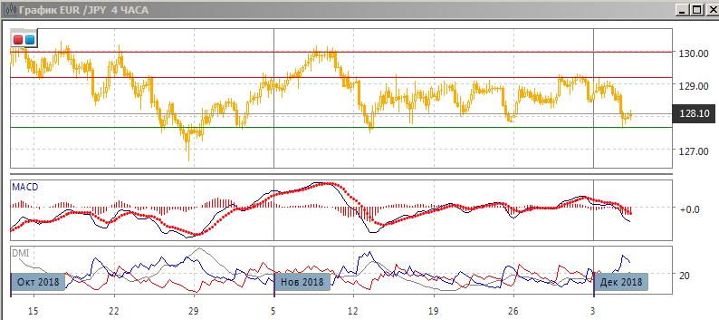 На четырёхчасовом графике пара вышла из более узкого диапазона 128,25-129,20 и достигла нижней границы более широкого на 127,60. Относительные минимумы и максимумы пары сейчас последовательно снижаются. По индикаторам направленного движения тенденцией является снижение: DM- выше DM+ при росте ADX, гистограмма MACD находится в отрицательной зоне, линия MACD имеет отрицательный наклон. Скорее, уровень 127,60 будет ещё тестироваться.