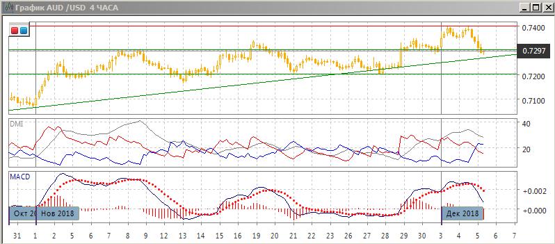 На четырёхчасовом графике пара перешла к снижению после образования двойной вершины у 0,7400. Пара достигла более низкого уровня, чем 30 ноября, и сейчас находится ниже «круглого» уровня 0,7300. По индикаторам направленного движения тенденцией стало снижение: DM- выше DM+, гистограмма MACD снижается в отрицательной зоне, линия MACD имеет отрицательный наклон. При закреплении ниже 0,7300 снижение скорее будет продолжаться, однако возвращение стабильно выше этого уровня может показать, что негативное влияние новостей не отметило тенденцию роста.