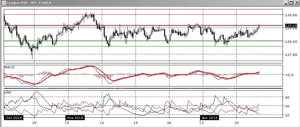 На четырёхчасовом графике также происходит движение в диапазоне 127,60-129,20. Пара находится у верхней границы, исходя из движения в диапазоне пара скорее будет снижаться к нижней границе. По индикаторам направленного движения флэт: ADX на низком уровне. Гистограмма MACD колеблется около нулевого уровня.