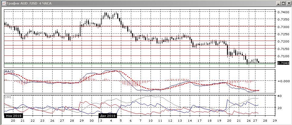 На четырёхчасовом графике отскок пары, кажется, завершается, что может вернуть пару к предыдущему минимуму у 0,7040. До отскока образовалось бычье расхождение минимумов пары и гистограммы MACD, однако подтверждения сигнал не получил. Снижение до возвращения к 0,7100 подтверждает продолжение тенденции (преодолённый уровень поддержки становится сопротивлением). По ADX тенденция снижения является сильной: превышение DM- над DM+ большое и в этом масштабе, ADX находится на высоком уровне.