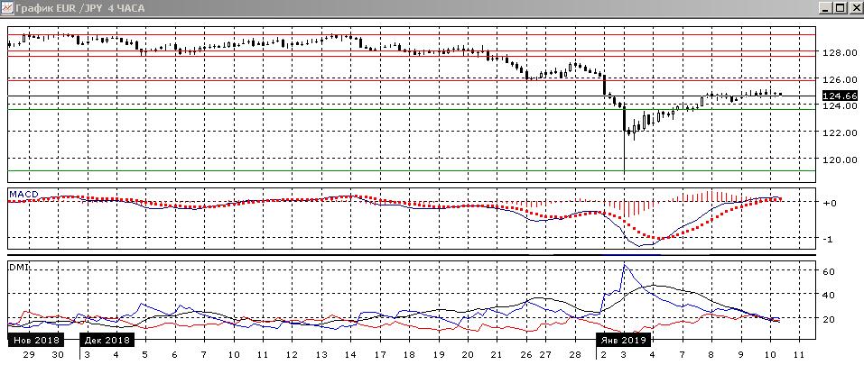 На четырёхчасовом графике рост пары замедлился, образовалось медвежье расхождение максимумов пары и гистограммы MACD, это увеличивает вероятность разворота и возобновления снижения пары после коррекции к снижению. Переход к возобновлению снижения был бы виден при преодолении поддержки на 123,65-124,00.
