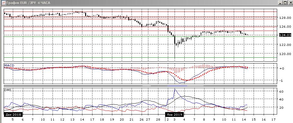 На четырёхчасовом графике пара преодолела уровни двух предыдущих относительных минимумов, теперь пара снижается. По индикаторам направленного движения тенденцией также стало снижение: DM- выше DM+, гистограмма MACD находится в отрицательной зоне, линия MACD развернулась. Ближайшей целью видится уровень 123,65 (остановка 4-7 января), но это слабый уровень и скорее снижение продолжится.