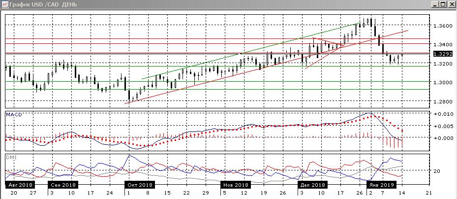На дневном графике снижение приостановилось на «круглом» уровне 1,3200, от него происходит отскок вверх и пара приблизилась к следующему «круглому» уровню на 1,3300. Так как поддержка на 1,3200 сильная и размер волны снижения был большим, отскок является естественным даже если тенденция снижения сохраняется. По индикаторам направленного движения тенденцией является снижение: превышение DM- над DM+ большое, гистограмма MACD растёт в отрицательной зоне, линия MACD имеет отрицательный наклон. Для ближайшей перспективы важно, будет ли закрытие выше 1,3300, это могло бы привести пару к следующему «круглому» уровню на 1,3400.