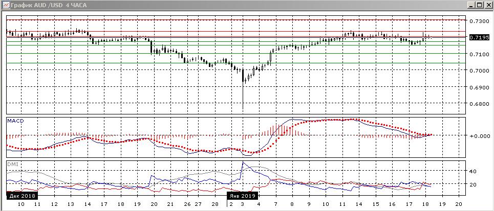 На четырёхчасовом графике разворот вниз от 0,7230 приостановился, хотя ранее пара вышла из более узкого диапазона 0,7170-0,7230 вниз. Последовательность снижения относительных максимумов и минимумов пары от 0,7230 сейчас нарушена. Однако 17 января ниже 0,7230 образовалась «падающая звезда», и это в не в пользу преодоления этого уровня сопротивления. В рамках движение в текущем диапазоне скорее предпочтительно снижение к 0,7150. По индикаторам направленного движения в этом масштабе пара во флэте: DM+ и DM- близки, гистограмма MACD около нулевого уровня, хотя её рост и разворот линии MACD предполагает возможность дальнейшего роста в краткосрочной перспективе.
