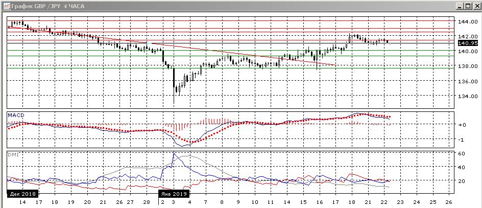 На четырёхчасовом графике пара снизилась от уровня 142,00. Она дважды достигла уровня 140,80, у максимума 16-17 января. Следующий за этим значимый уровень — 140,00. Преодоление уровня 140,80 образовал бы последовательность снижения относительных максимумов и минимумов пары. Более долгосрочно кажется что рост возобновится после возможной коррекции, так как снижение не возобновилось от уровня 139,25, и после нескольких тестирований этого уровня произошёл разворот тенденции.