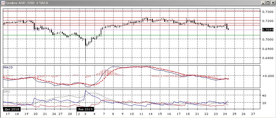 На четырёхчасовом графике продолжилось последовательное снижение, и после ложного пробоя сопротивления на 0,7150 пара достигла следующего «круглого» уровня на 0,7100. Сейчас на 0,7230 можно видеть тройную вершину, и это скорее делает вероятным более существенное снижение, чем уже было от этого уровня. Сопротивление на 0,7150, скорее, укрепилось.