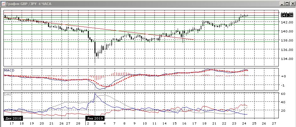 На четырёхчасовом графике рост продолжается, и новая консолидация происходит выше уровня 143,00. Образовалось медвежье расхождение максимумов пары и гистограммы MACD, что увеличивает вероятность отката пары. По ADX тенденция стала сильной: превышение DM+ над DM- увеличилось, ADX выросла до относительно высокого уровня.