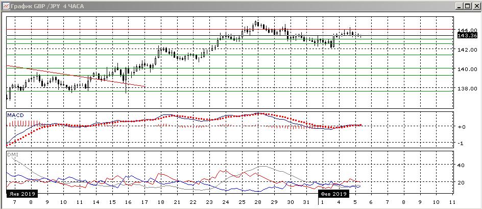 На четырёхчасовом графике последовательность снижения относительных максимумов и минимумов пары нарушена, паре преодолела последние максимумы. Пара закрепилась выше ранее преодолённого уровня поддержки на 143,00, однако и развития роста выше 144,00 не было ( там образовалась «падающая звезда», что, однако, не имело продолжения так как пара удерживается выше 143,00). Положение неопределённое, и скорее лучше подождать выхода пары ниже 143 (в этом случае завершается краткосрочная коррекция вверх), или выше 144,00 (в этом случае завершается более масштабная коррекция к росту, которая продолжалась 28 января — 1 февраля.