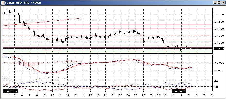 На четырёхчасовом графике последовательность снижения относительных максимумов и минимумов пары сохраняется, но тенденция снижения ослабляется. По индикаторам это видно по уменьшению превышения DM- над DM+, постепенному развороту линии MACD, новые минимумы не подтверждаются по гистограмме MACD (образовалось уже тройное бычье расхождение, что увеличивает вероятность отскока вверх). Однако в до фактического разворота идти против сильной тенденции снижения слишком рискованно, тем более что она кажется достаточно сильной на более крупном масштабе достичь важного психологического уровня 1,3000.