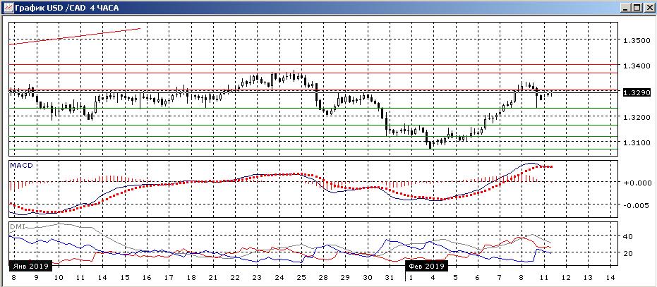 На четырёхчасовом графике откат завершился образованием «молота» выше уровня поддержки на 1,3230. И пара вернулась к сопротивлению на 1,3300. Вероятно, этот уровень будет тестироваться, и учитывая, что рост является сейчас хорошо выраженной тенденцией, скорее уровень будет преодолён. По индикаторам направленного движения в этом масштабе коррекция к снижению: превышение DM+ над DM- сохраняется, гистограмма MACD снизилась ниже нулевого уровня. Ключевым для дальнейшего движения в краткосрочной перспективе, вероятно, является то, будет ли преодолено сопротивление на 1,3300. Если пара закрепится выше, ближайшая цель — максимумы конца января у 1,3370.