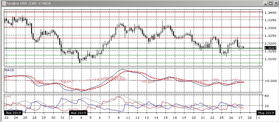 На четырёхчасовом графике также продолжается последовательное снижение, после резкого снижения 26 февраля от уровня 1,3230 снижение приостановилось у поддержки на 1,3165, но коррекции вверх от этого уровня не было. Пока более вероятным кажется, что снижение продолжится, при преодолении уровня 1,3165, что соответствует более долгосрочной тенденции.