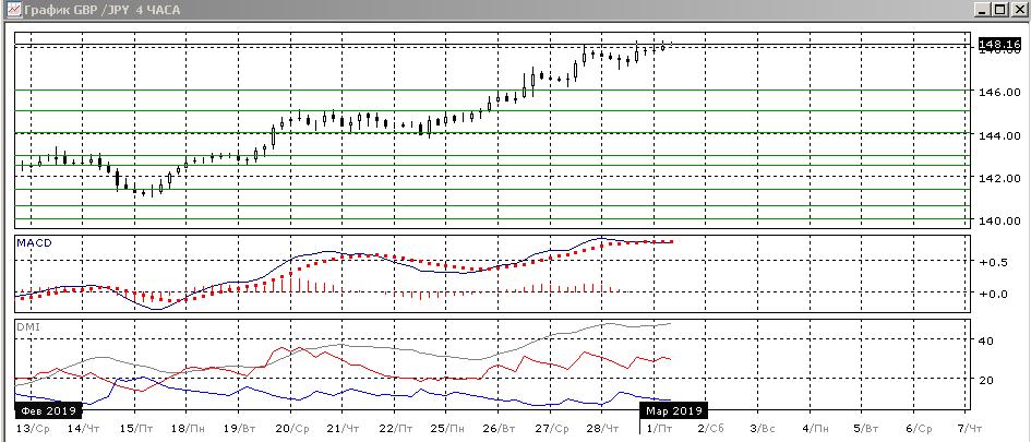 На четырёхчасовом графике рост пары продолжился, но видно замедление: новые максимумы не подтверждаются по гистограмме MACD. Кроме этого, у уровня 148,00 образовывались верхние тени свечей. Однако в начале дня пара всё же преодолевает этот уровень и скорее тенденция сохраняется — ситуация изменилась бы, если бы пара вернулась ниже 148,00, тогда может возникнуть картина ложного пробоя уровня. По ADX тенденция роста является сильной: превышение DM+ над DM- большое и устойчивое, ADX на высоком уровне. Учитывая это в целом даже если откат и будет, продолжение роста остаётся пока предпочтительным.