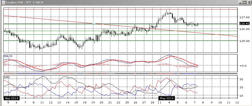 На четырёхчасовом графике снижение замедляется, это видно по уменьшению наклона последовательность относительных минимумов и максимумов. Пара не закрепилась ниже уровня 126,35, на котором были максимумы 25 и 27 февраля, и здесь может образоваться база для возвращения к 127,60 (если текущее снижение рассматривать как коррекцию к росту).