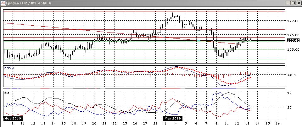На четырёхчасовом графике рост пары от 124,25 приостановился ниже уровня сопротивления на 125,80. При это волна роста остаётся в пределах коррекции к предыдущему снижению от 127,60. Сейчас можно рассматривать «флаг» между 125,50 и 125,80. В рамках этой узкой консолидации предпочтителен рост к верхней границе на 125,80. Более значительное движение скорее будет в направлении выхода из флага.