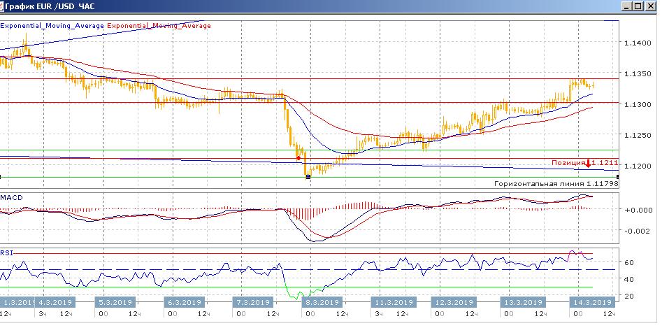 В краткосрочной перспективе, как это видно на часовом графике, скользящие средние ЕМА21 и ЕМА55 продолжают расти и немного расходятся, однако, это не влияет на общую техническую картину данного рынка. Индикаторы MAСD и RSI вышли высоко в область выше своих центральных линий, что сигнализирует о намерении этого рынка продолжить восходящую тенденцию после небольшой коррекции.