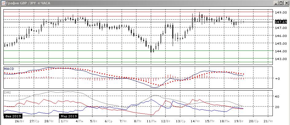 На четырёхчасовом графике последовательность роста относительных максимумов и минимумов пары нарушена, и теперь они снижаются. Это делает снижение в краткосрочной перспективе продолжение снижения более вероятным. По более краткосрочным индикаторам направленного движения тенденцией тоже становится снижение: гистограмма MACD теперь в отрицательной зоне, линия MACD имеет отрицательный наклон. Ближайшая поддержка на 147,00 (этот уровень проявлялся как поддержка и сопротивление с конца февраля).