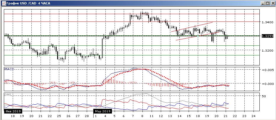 На четырёхчасовом графике пара после «флага» 14-18 марта продолжила снижение отскок вверх был ограничен нижней границей флага. Однако последний относительный минимум был выше предыщущего, и этом может обозначать отскок. Размер снижения был более 200 пунктов с 8 марта, и это, при текущем уменьшении волатильности, относительно много без существенной коррекции. В краткосрочной перспективе важным, вероятно, является то, закрепится ли пара выше или ниже уровня 1,3300: если пара останется ниже этого уровня, то возможно продолжение снижения для полной компенсации волны роста от 1,3130. Если пара закрепится выше 1,3300, то это говорило бы о формировании разворота и возможному возвращению к 1,3450.