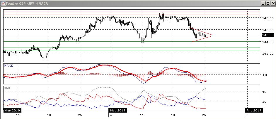 На четырёхчасовом графике после волны снижения от 148,00 до 144,00 образовался небольшой треугольник. Так как это фигура продолжения, более вероятно, что выход из треугольника будет вниз с дальнейшим снижением и ближайшей целью — тестирования уровня 144,00. По индикаторам направленного движения тенденция снижения — коррекция к с снижению, также усиливается: превышение DM- над DM+ остаётся очень большим, ADX на высоком уровне, коррекция видна по росту гистограммы MACD и развороту линии MACD.