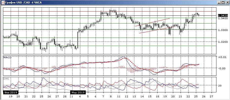 На дневном графике пара выросла после относительно длительного (с 13 марта) тестирования уровня поддержки 1,3300. При этом проколы уровня не завершались его преодолением, и в результате пара выросла к уровню сопротивления на 1,3450 (близкому к исходной точке снижения. Выше 1,3450 может образоваться медвежье расхождение максимумов пары и гистограммы MACD, это увеличило бы вероятность отката. То, что пара всё-таки выросла от 1,3300 — бычий признак, и более долговременно с начала февраля пара последовательно растёт. Поэтому в перспективе рост кажется более предпочтительным, но пока риска отката от 1,3450 видится большим. Закрытие выше 1,3450 (у предыдущего максимума марта) облегчило бы дальнейшее движение вверх.