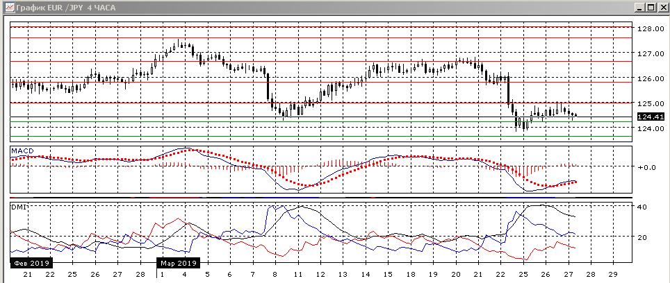 На четырёхчасовом графике отскок вверх от 124,00 остановился на 125,00 — ниже этого уровня образовалась пара «падающих звезд» которые потом были подтверждены снижением. Откат от 125,00 получил поддержку около минимума 8 марта на 124,25. По индикаторам направленного движения — коррекция к снижению: превышение DM- над DM+ сохраняется, но гистограмма MACD растёт, а линия MACD развернулась. Исходя из представления, что отскок пары вверх 25-26 марта был коррекцией, ближайшей целью видится возвращение к исходному уровню ниже 124,00.
