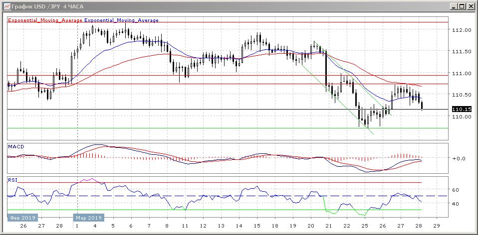 На этой неделе медведи пока исчерпали свой нисходящий потенциал в краткосрочной перспективе и теперь цена консолидируется в рамках уровня поддержки на 109.71(мин. от 25 марта) и уровня сопротивления на 110.73(макс. от 27 марта).