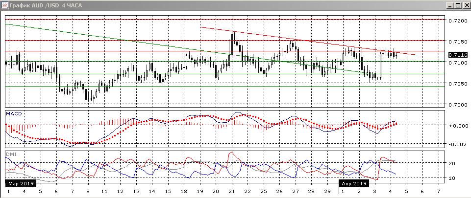 На четырёхчасовом графике происходит консолидация выше 0,7100, но ниже линии краткосрочного нисходящего тренда, после резкого скачка выше 0,7100 3 апреля. Дальнейшая перспектива зависит, скорее, от того, будет ли преодолён уровень 0,7125 и линия тренда — в этом случает тенденция снижения с 21 марта изменилась бы. При возвращении ниже 0,7100 скорее пара будет возвращаться к минимумам конца марта — начала апреля.