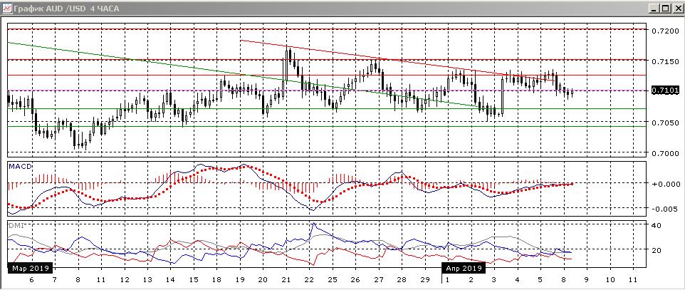 На четырёхчасовом графике также продолжается движение в диапазоне. Однако после образования двух относительных максимумов около 0,7135 пара снизилась ниже предыдущего относительного минимума (4 апреля), и ниже «круглого» уровня 0,7100 (он теперь является ближайшим сопротивлением), и это открывает пространство для снижения к зоне поддержки на 0,7050-0,7070. По индикаторам направленного движения флэт: ADX на низком уровне, гистограмма MACD около нуля.