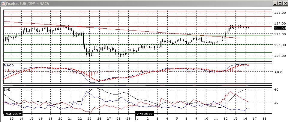 На дневном графике пара достигла уровня сопротивления на 126,65 (около максимумов середины марта. Уровень не преодолён, но пара закрепилась ниже краткосрочной линии тренда по максимумам марта. Кроме этого, нарушена последовательность снижения относительных максимумов. По индикаторам направленного движения тенденцией стал рост: DM+ выше DM-, гистограмма MACD растёт в положительной зоне, линия MACD имеет положительный наклон. Достижение следующего сильного сопротивления на 127,60 видится предпочтительным.
