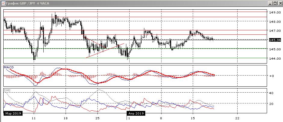На четырёхчасовом графике можно выделить более узкий диапазон 145-147. Пар сейчас снижается от верхней границы к после образования там двойной вершины и преодоления промежуточного минимума у уровня поддержки/сопротивления 146,50. Исходя из движения в диапазоне, целью снижения сейчас видится нижняя граница на 145,00.