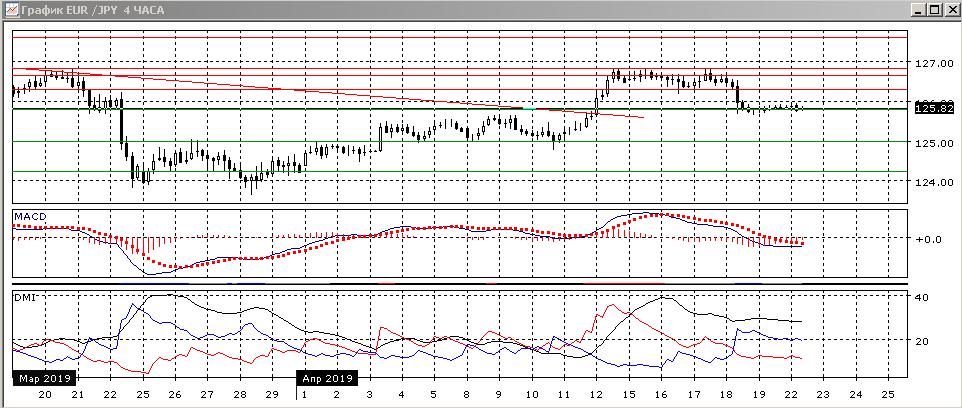 На четырёхчасовом графике после образования двойной вершины у 126,85 пара снизилась, преодолев промежуточный минимум двойной вершины. Сейчас происходит консолидация в узком диапазоне около уровня поддержки 125,80. По индикаторам направленного движения тенденцией стало снижение: DM- устойчиво выше DM+, ADX на относительно высоком уровне, гистограмма MACD находится в отрицательной зоне, линия MACD сохраняет отрицательный наклон. Относительные максимумы и минимумы пары сейчас снижаются, и скорее снижение целью сейчас будет ближайшая сильная поддержка на 125,00.