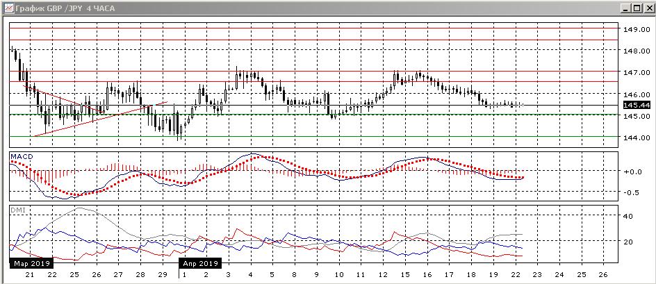 На дневном графике пара после снижения от 147,00 и приближается к 145,00 (поддержка на предыдущем минимуме). Тенденция по индикаторам направленного движения слабая: ADX на достаточно низком уровне, гистограмма MACD около нуля, линия MACD почти горизонтальна. Учитывая, что тенденция слабая, поддержка на уровне 145,00 может устоять.