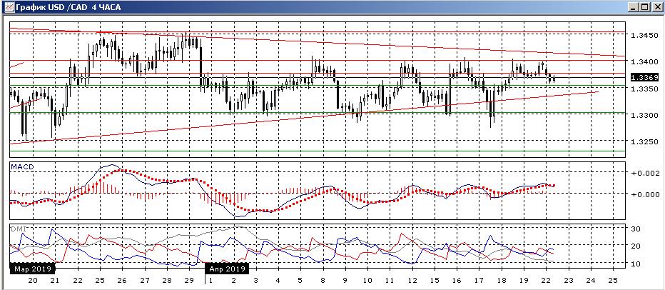 На четырёхчасовом графике пара осталась в узком диапазоне с начала апреля 1,3300-1,3400 и снизилась от верхней границы. При этом был преодолён предыдущий относительный минимум. Также пара преодолела уровень поддержки на 1,3375. В рамках движения в диапазоне более вероятно снижение к нижней границе на 1,3300. По индикаторам направленного движения также флэт: DM+ и DM- пересекаются, ADX на очень низком уровне, гистограмма MACD около нуля.