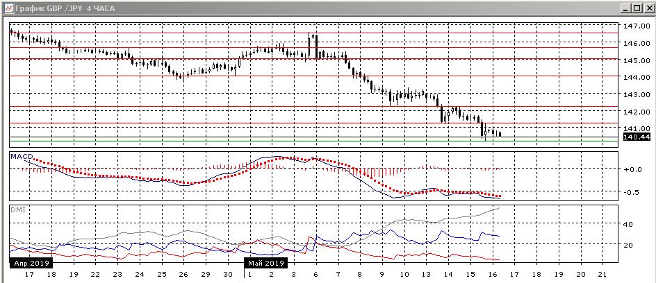 На дневном графике пара преодолела уровень поддержки в феврале на 141,25. Снижение уже больше цели измеренного движения, равного размеру диапазона марта-апреля (у 141,00). Скорее это открывает пространство для дальнейшего снижения, так как близкой поддержки сейчас не видно. По индикаторам направленного движения тенденция снижения усилилась: превышение DM- над DM+ увеличилось, ADX на относительно высоком уровне, линия MACD имеет отрицательный наклон, гистограмма MACD остаётся в отрицательной зоне.