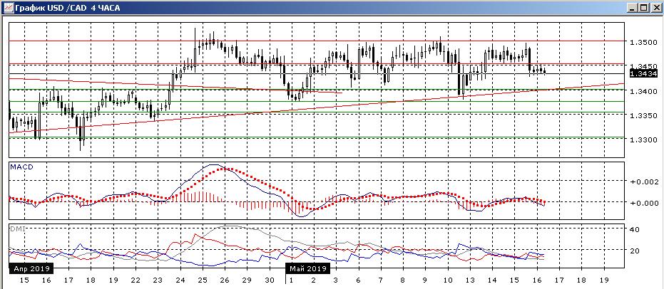На четырёхчасовом графике пара преодолела поддержку на 1,3450, этот уровень уже выступил сопротивлением при отскоке вверх после преодоления этого уровня. Если рассматривать диапазон 1,34-1,35, то в нём преодолела середину диапазона, и это открывает пространство для снижения к нижней границе диапазона у 1,3400. По индикаторам направленного движения пара остаётся во флэте: DM+ и DM- близки, ADX на низком уровне, гистограмма MACD колеблется около нуля.