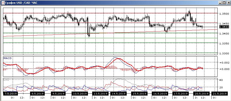 На дневном графике ситуация мало изменилась: сохраняется движение между линией восходящего тренда и уровнем сопротивления на 1,3500. Пара после возможного «ложно прорыва снижается к зоне сильной поддержки у линии тренда, «круглого» уровня 1,3400. По индикаторам направленного движения сейчас флэт: ADX на очень низком уровне, DM+ и DM- близки, гистограмма MACD колеблется около нуля, линия MACD также. При отсутствии выраженного движения скорее пара будет оставаться в диапазоне. Диапазон 1,34-1,35 лучше виден на четырёхчасовом графике.