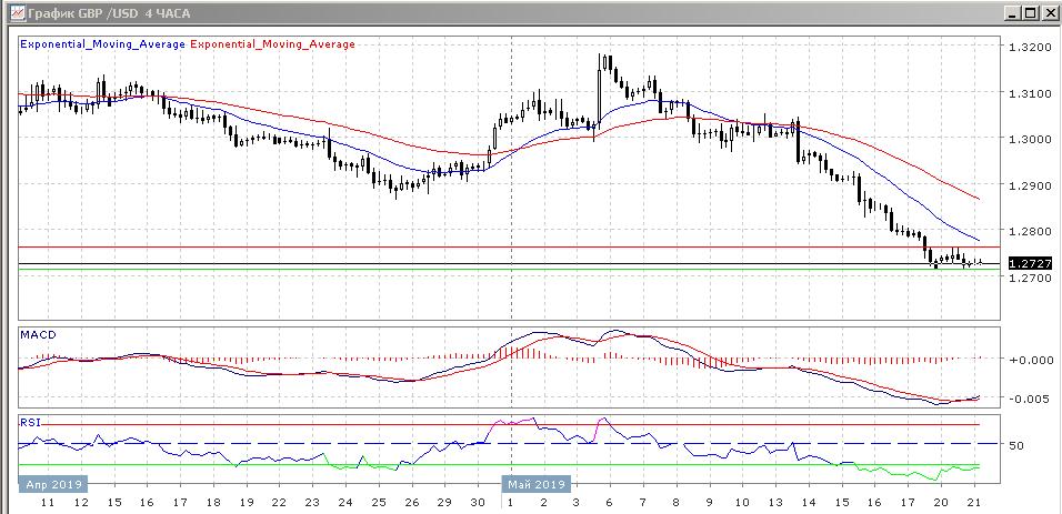 Скользящие средние с периодом 21 и 55 дней уверенно снижаются, а четырёхчасовой график остаётся далеко ниже последних, что говорит о значительном преимуществе продавцов.