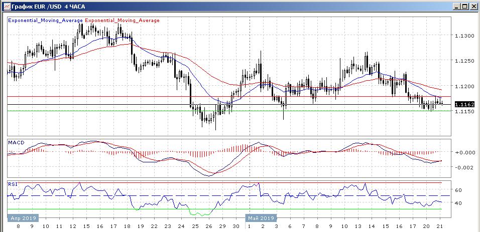 Во время азиатской торговой сессии четырёхчасовой график данной валютной пары остаётся в области ниже скользящих средних с периодом 21 и 55 дней, что говорит о продолжении нисходящей тенденции, при заметном расхождении этих линий.