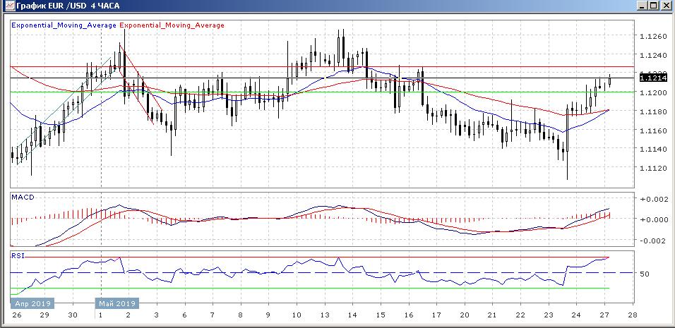 Гистограмма MACD вышла в область выше своей центральной линии и так же растёт, а индикатор силы движения RSI достиг линии 70, что так же свидетельствует о сильном восходящем потенциале рынка.