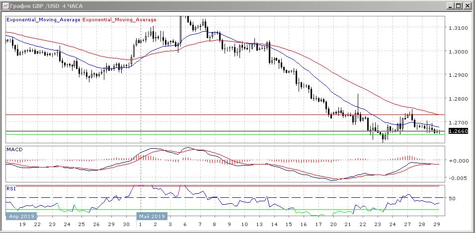 Скользящие средние с периодом 21 и 55 дней продолжают снижаться, оставляя четырёхчасовой график ниже, что говорит о медвежьем настрое данного рынка.