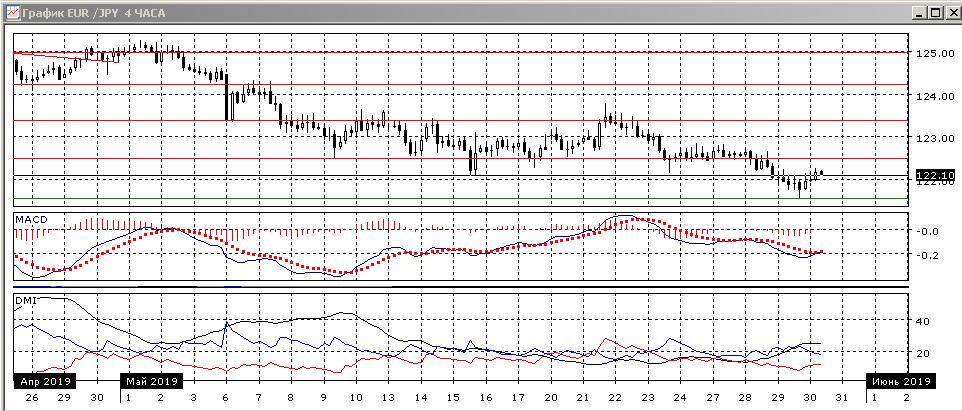 На четырёхчасовом графике также образовалось бычье расхождение минимумов пары и гистограммы MACD. В ближайшей перспективе это может привести пару к ранее преодолённому сопротивлению на 122,50. По индикаторам направленного движения коррекция к снижению: превышение DM- над DM+ сохраняется, но гистограмма MACD растёт и уже вышла из отрицательной зоны, линия MACD получила положительный наклон.