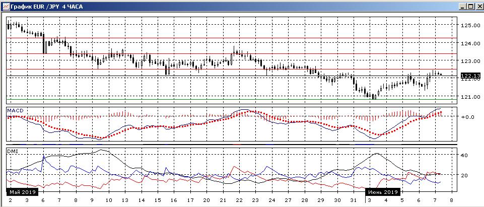 На дневном графике отскок достиг уровня сопротивления на 122,50 (поддержка в мае), здесь он может остановиться. По индикаторам направленного движения — коррекция к снижению — превышение DM- над DM+ остаётся очень большим, ADX на высоком уровне, коррекция видна по росту гистограммы MACD, которая достигла нуля и развороту линии MACD. Последовательность снижения относительных максимумов и минимумов пары не нарушена. Так как ранее образовалось бычье расхождение минимумов пары и гистограммы MACD, преодоление уровня 122,50, если оно случится, может стать подтверждающим сигналом. Но если рассматривать рост как коррекционный, то более вероятно снижение к минимуму июня.